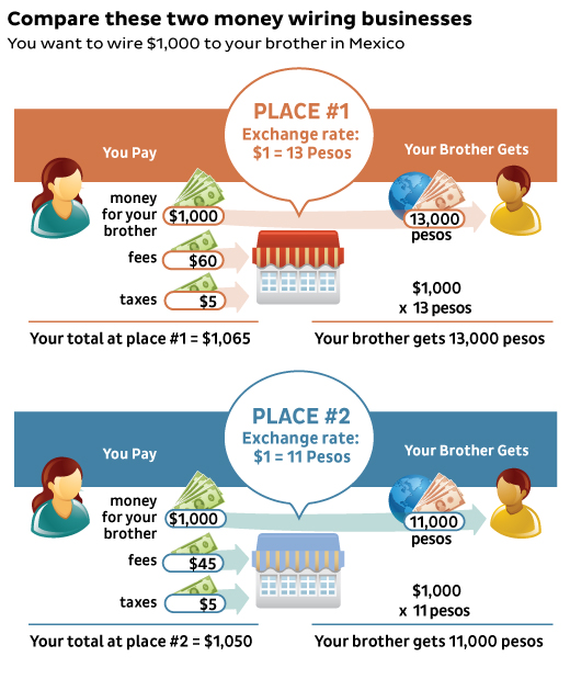 At Place 1, you pay $15 more than at Place 2. But look at the exchange rate. The rate is better at Place 1. Your brother gets 2,000 pesos more than he would at Place 2.